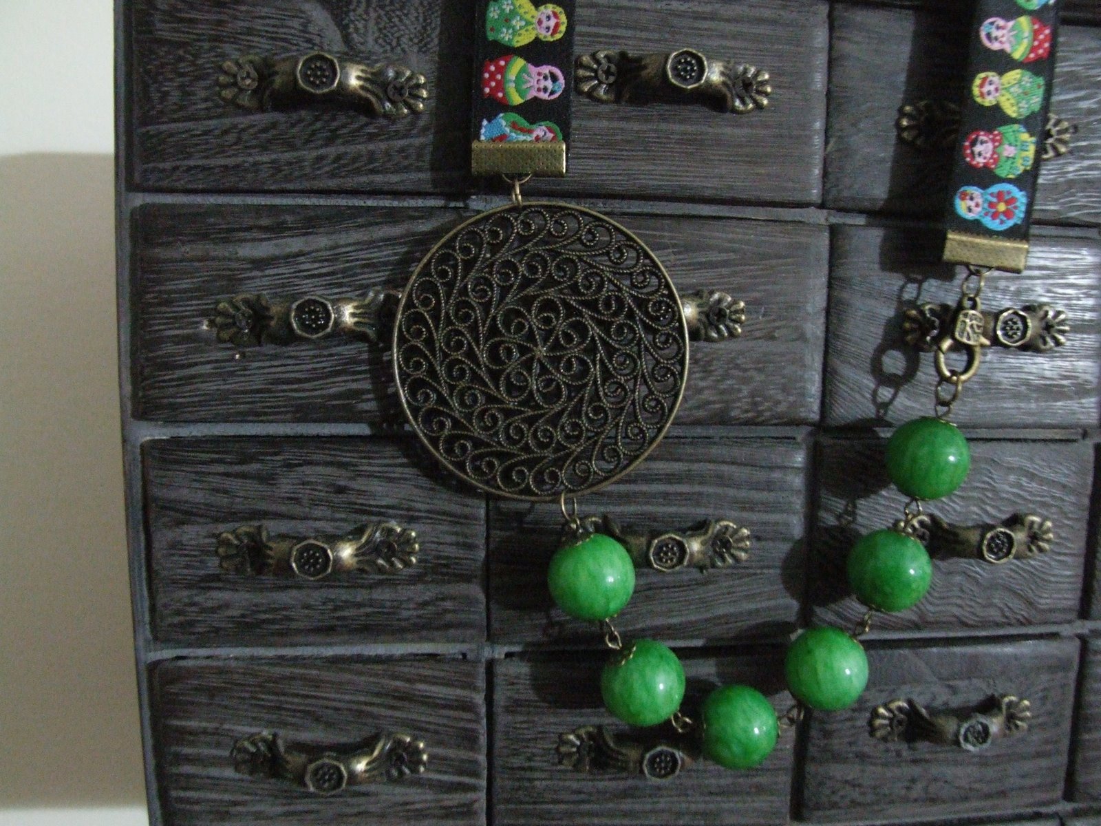 2011V157 Colar Curto Galão Preto Matrioskas, Peça Bronze Redonda e Bolas Pedra Verde
